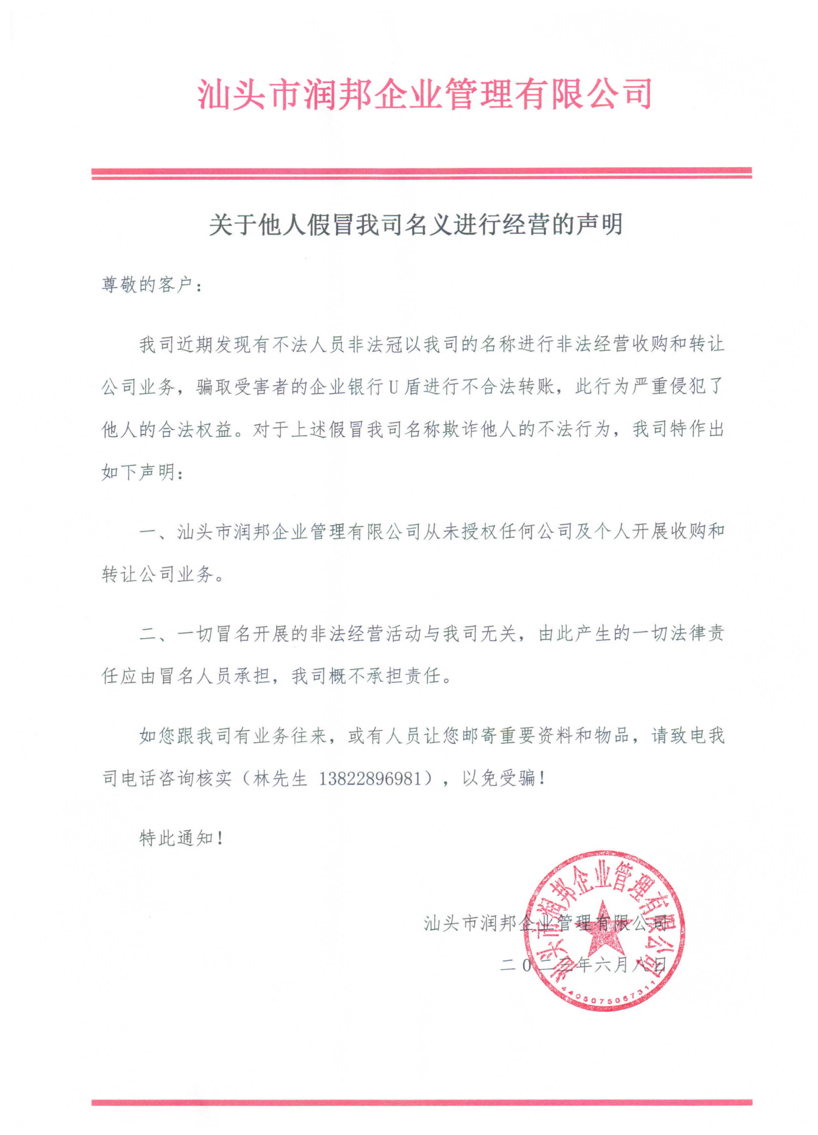 關于近期有陌生來電反映有不法分子冒用我司名義對他人采取高價收購公司,騙取企業主對公賬戶U 盾一事做出聲明。